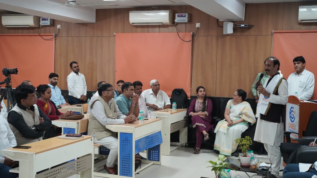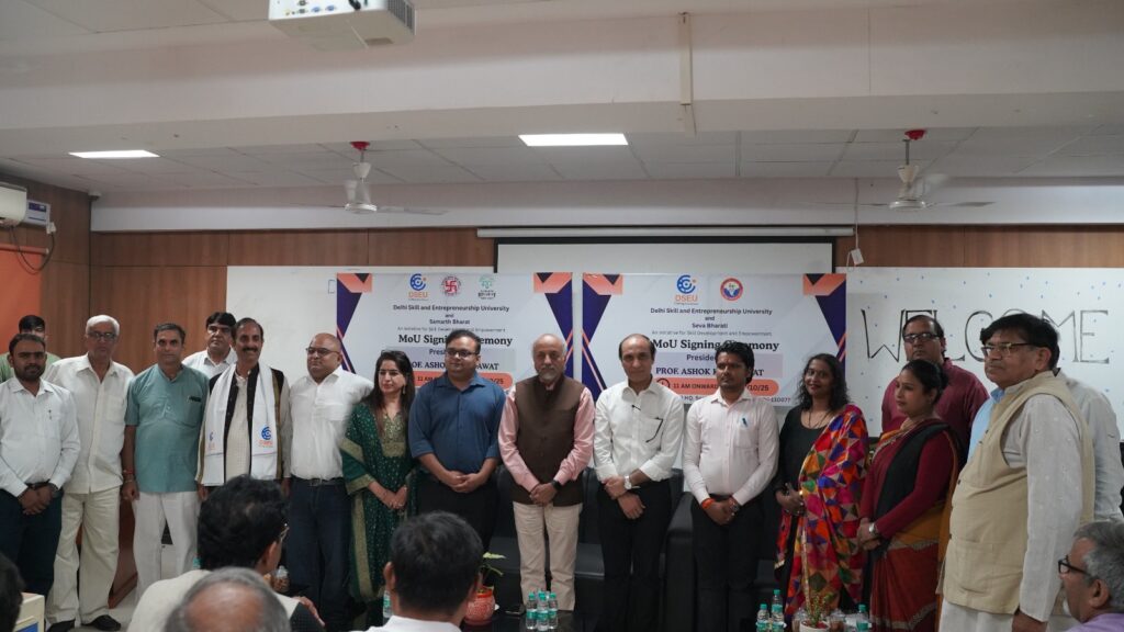 In his address, Hon’ble Vice Chancellor emphasized DSEU’s vision of transforming education from a colonial model into a more practical, skill-oriented framework. He stressed that skill-based learning must reach every section of society through short-term, outcome-oriented programs — adding that “the real measure of education is not the length of the course, but the mastery of the skill.” He also highlighted that all MoUs signed by DSEU are reviewed quarterly to ensure tangible outcomes and meaningful collaboration. He expressed confidence that partnerships with Samarth Bharat and Sewa Bharti will catalyze new skill development programs, benefiting underprivileged and marginalized communities.